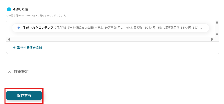 テストに成功すると、取得した値の各項目の横に先ほど送信したGmailの詳細情報が表示されるので「保存する」をクリックします。