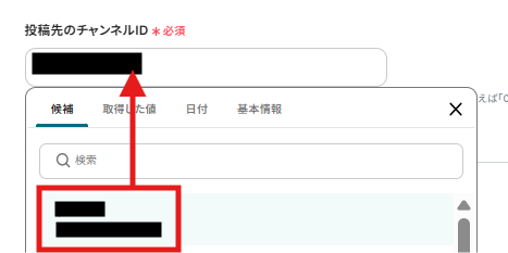 編集欄をクリックすると、Slackのチャンネル候補が表示されるので、そこから対象のチャンネルを選択します。選択するとIDが自動で入力されます。