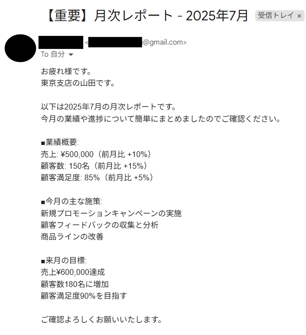 編集欄をクリックし、Gmailの内容を引用して、下記のように入力しました。