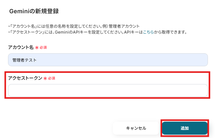 アクセストークンはGeminiのAPI取得ページから取得可能です。