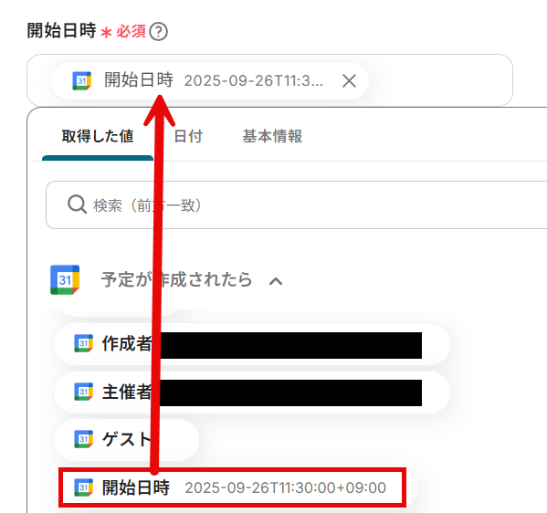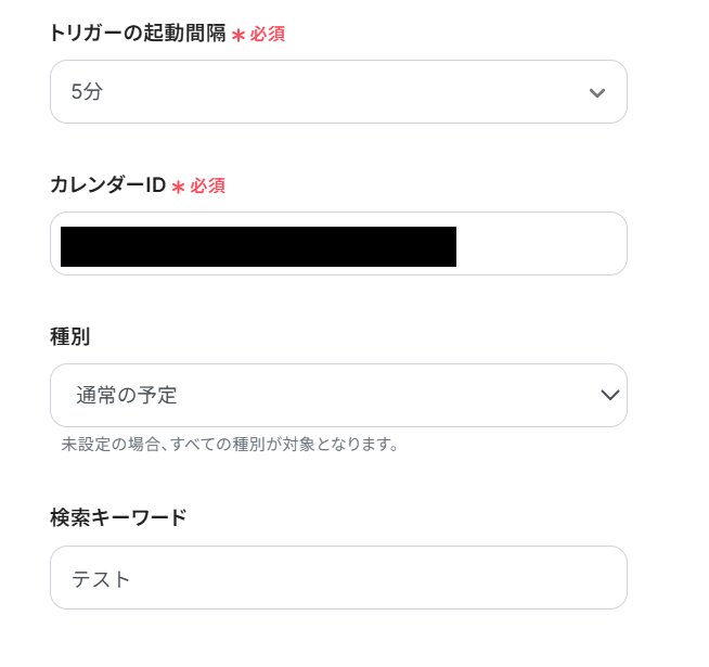 - トリガーアクション:Googleカレンダーに予定が作成されたら起動します。