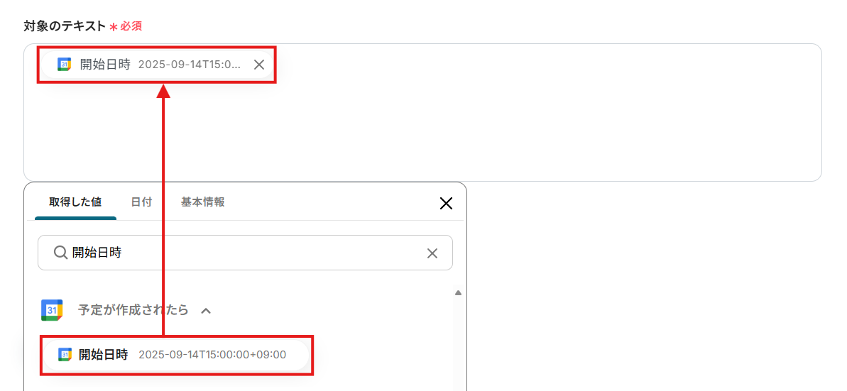 入力欄をクリックすると、連携しているアカウントから候補が表示されますので、対象となるカレンダーを選択してください。