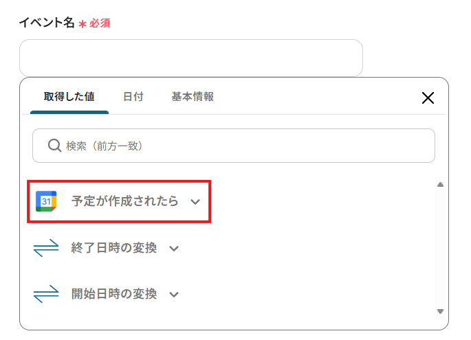 - Googleカレンダーの「予定が作成されたら」をクリック。