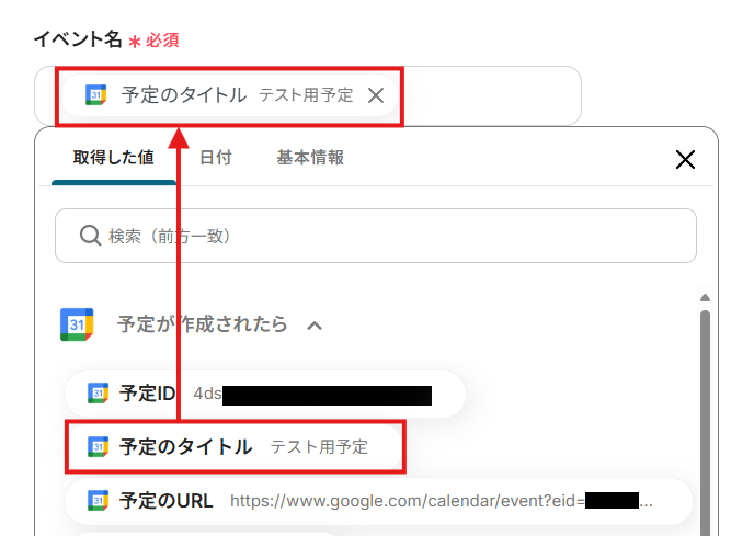 下図のように設定する場合は、「テスト用」を含む予定が作成された場合にのみフローが起動します。