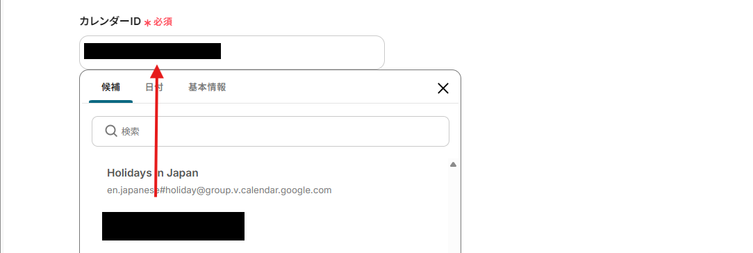カレンダーIDは、枠内をクリックし表示された候補から任意で選択してください。