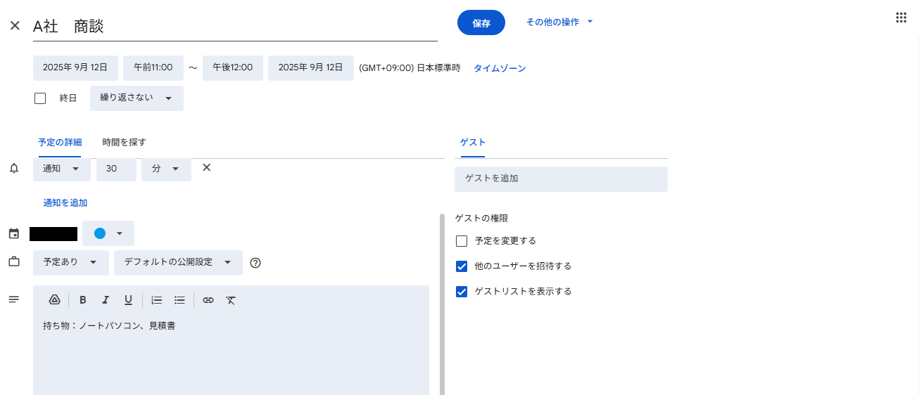 Googleカレンダーを開き、テスト用の予定を作成してください。