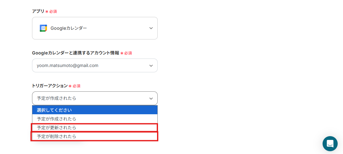Googleカレンダーのトリガーアクションを「予定が更新されたら」もしくは「予定が削除されたら」に変更することで設定できます。