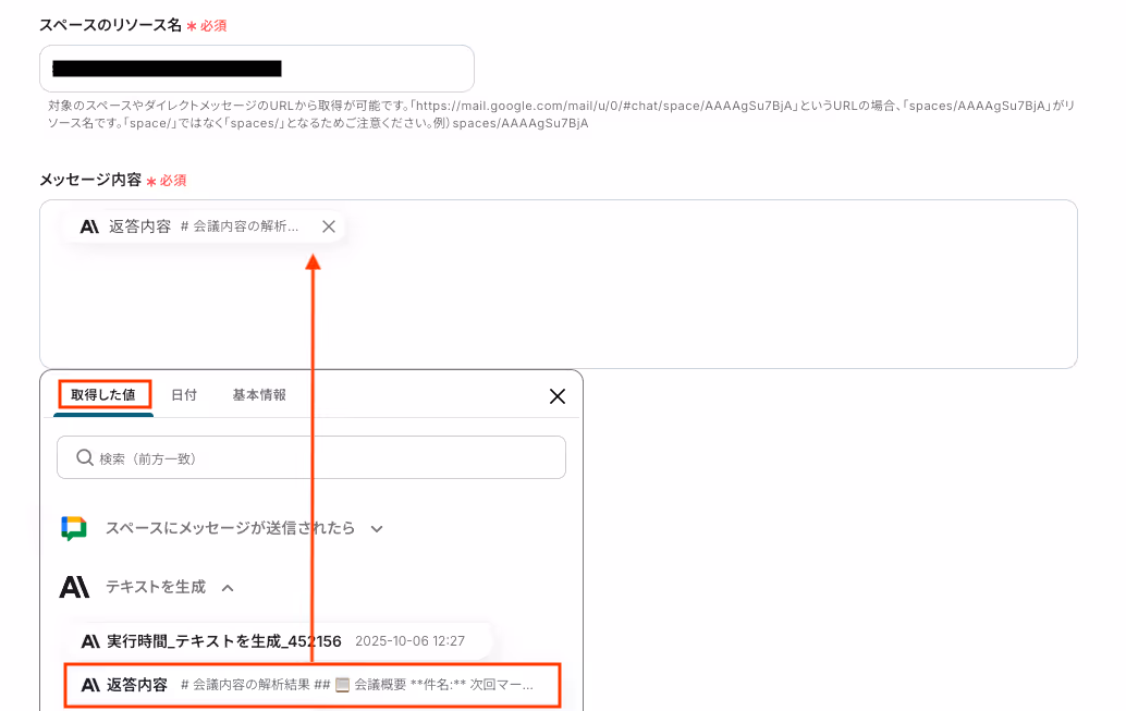 「スペースのリソース名」を候補から選択し、「メッセージ内容」は取得した値から選択します。