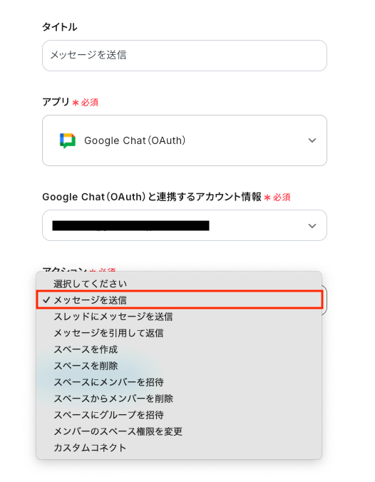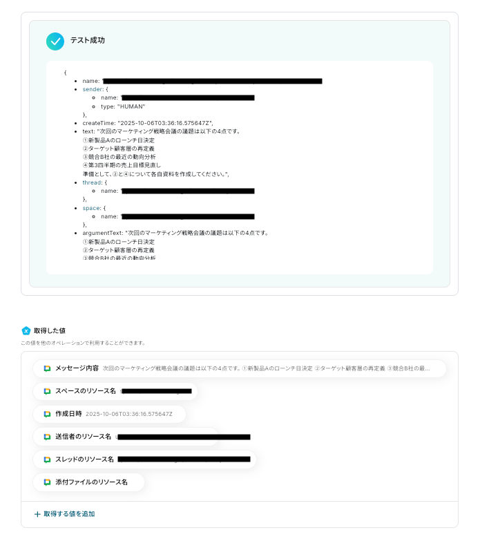 「スペースのリソース名」を候補から選択し、「メッセージ内容」は取得した値から選択します。 取得した値を使用することで、メッセージに毎回最新情報が反映されます。