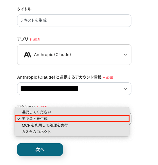 ステップ4:Anthropic(Claude)のアクション設定