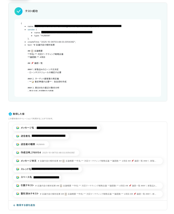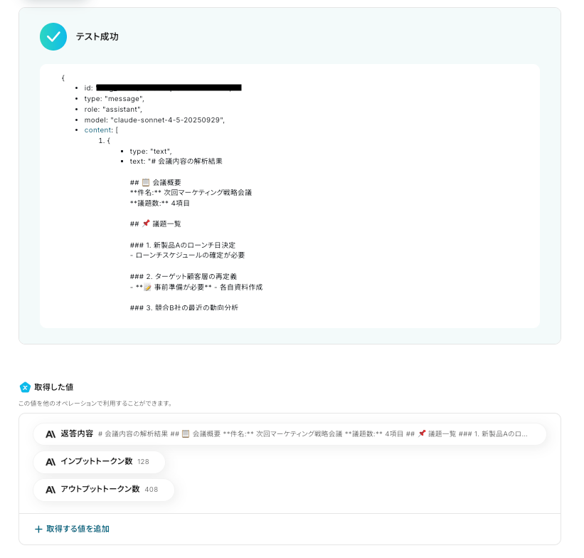 テストが成功すると、以下のように「取得した値 」が表示されます。 「取得した値」は、後のフローで使用します。