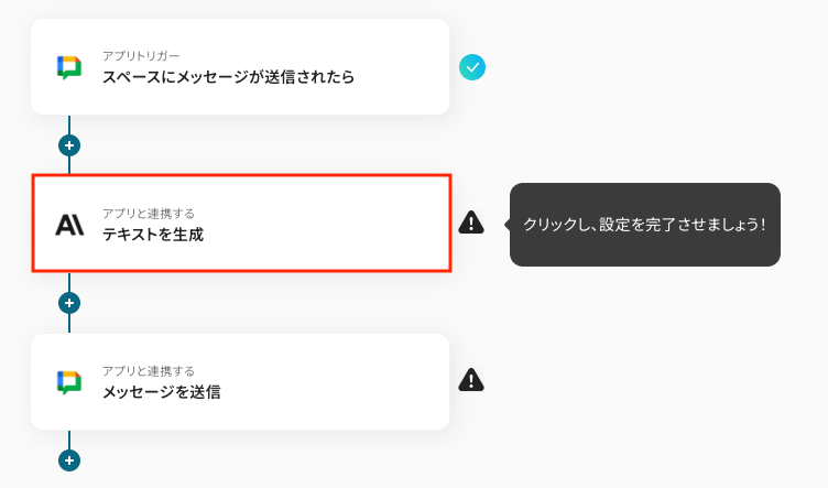Google Chatのトリガー設定では、メッセージの受信を検知したいスペースのリソース名を任意で設定してください。 分岐機能では、メッセージ本文に特定のキーワードが含まれている場合のみ後続の処理を実行するなど、前のステップで取得した情報をもとに条件を自由にカスタマイズできます。 Anthropic(Claude)のオペレーションでは、テキストの要約や感情分析など、目的に応じてテキストを生成するためのプロンプトを自由にカスタマイズでき、前段で取得した情報を変数として利用可能です。 Google Chatへの通知オペレーションでは、通知先のスペースを任意で設定できるほか、本文に固定のテキストを入力したり、前段のステップで取得した値を変数として埋め込んだりすることが可能です。 ■ 注意事項