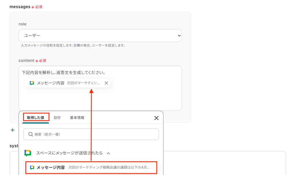 「role(=メッセージの役割がユーザーかアシスタントかを決める項目)」を確認し、「content(=AIへの指示内容)」は取得した値から選択します。 画像のように、取得した値を使用することで、毎回最新のメッセージ内容が反映されます。