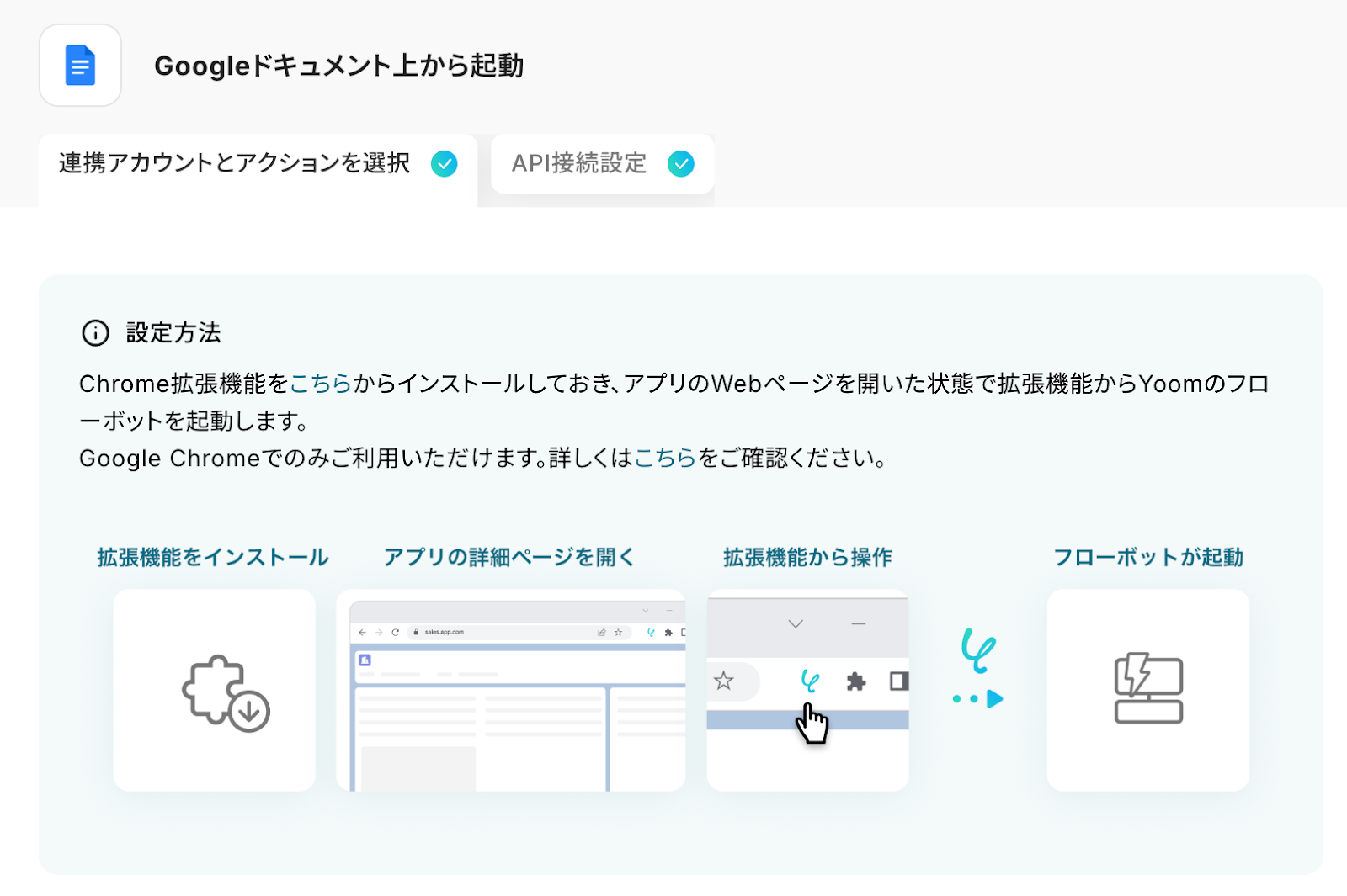 Chrome拡張機能を設定することで、Googleドキュメント上から直接フローボットを起動することが可能です。 拡張機能はこちら のページからインストールできます。