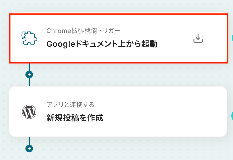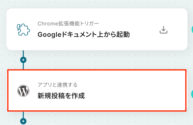 Chrome拡張機能トリガーの設定で、ワークフローを起動させたいGoogleドキュメントのURLサンプルを任意に設定することが可能です WordPress.orgへの投稿作成アクションでは、タイトルや本文、カテゴリーなどの各項目に、固定のテキストや前段のトリガーで取得した情報を変数として自由にマッピングできます ■注意事項