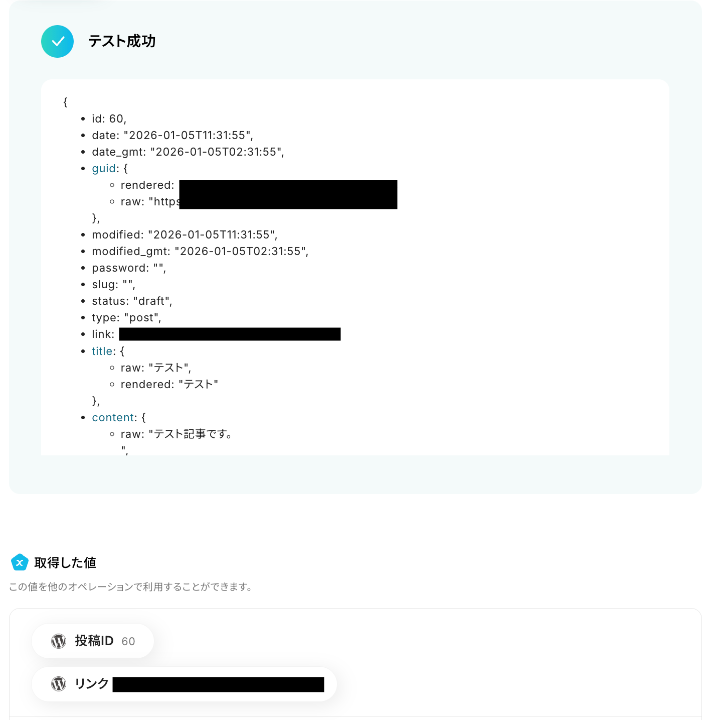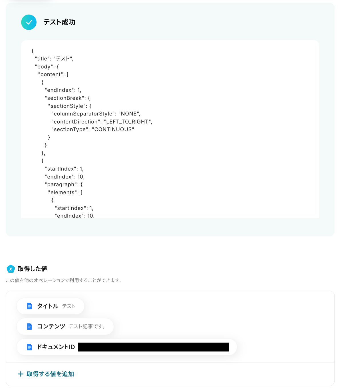 テストに成功すると、Googleドキュメントに作成された記事の内容に関する情報が一覧で表示されます。 以下の取得した値を利用して、WordPress.orgで新規投稿の作成が可能です。 ※取得した値 とは? トリガーやオペレーション設定時に、「テスト」を実行して取得した値のことを指します。 後続のオペレーション設定時の値として利用でき、フローボットを起動するたびに変動した値となります。