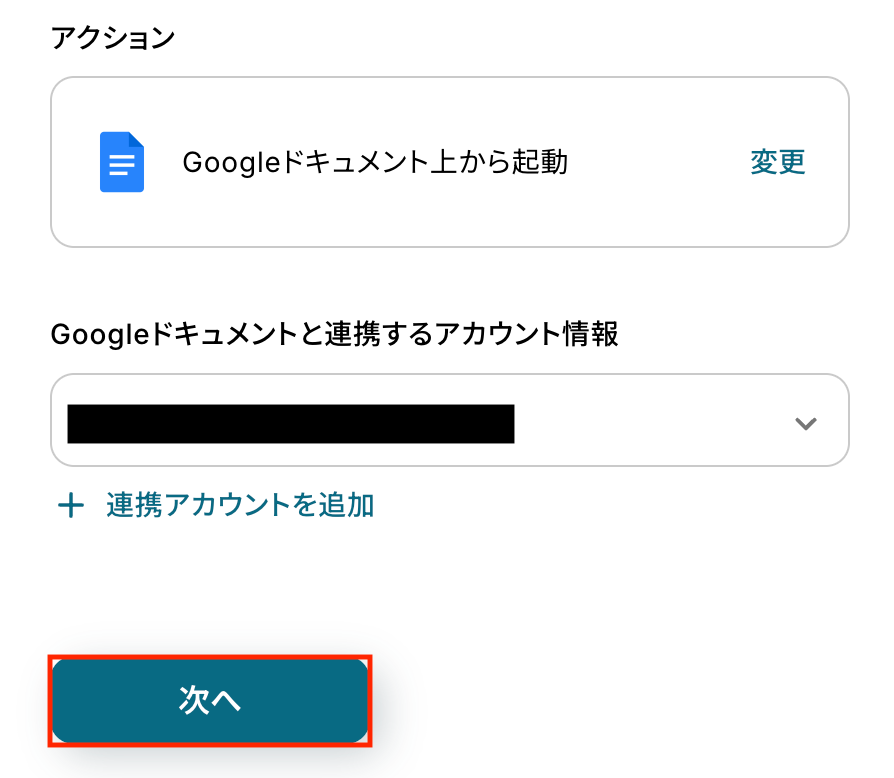アクションの設定内容を確認し、Googleドキュメントと連携しているアカウント情報にも問題がないか確認したら「次へ」をクリックします。
