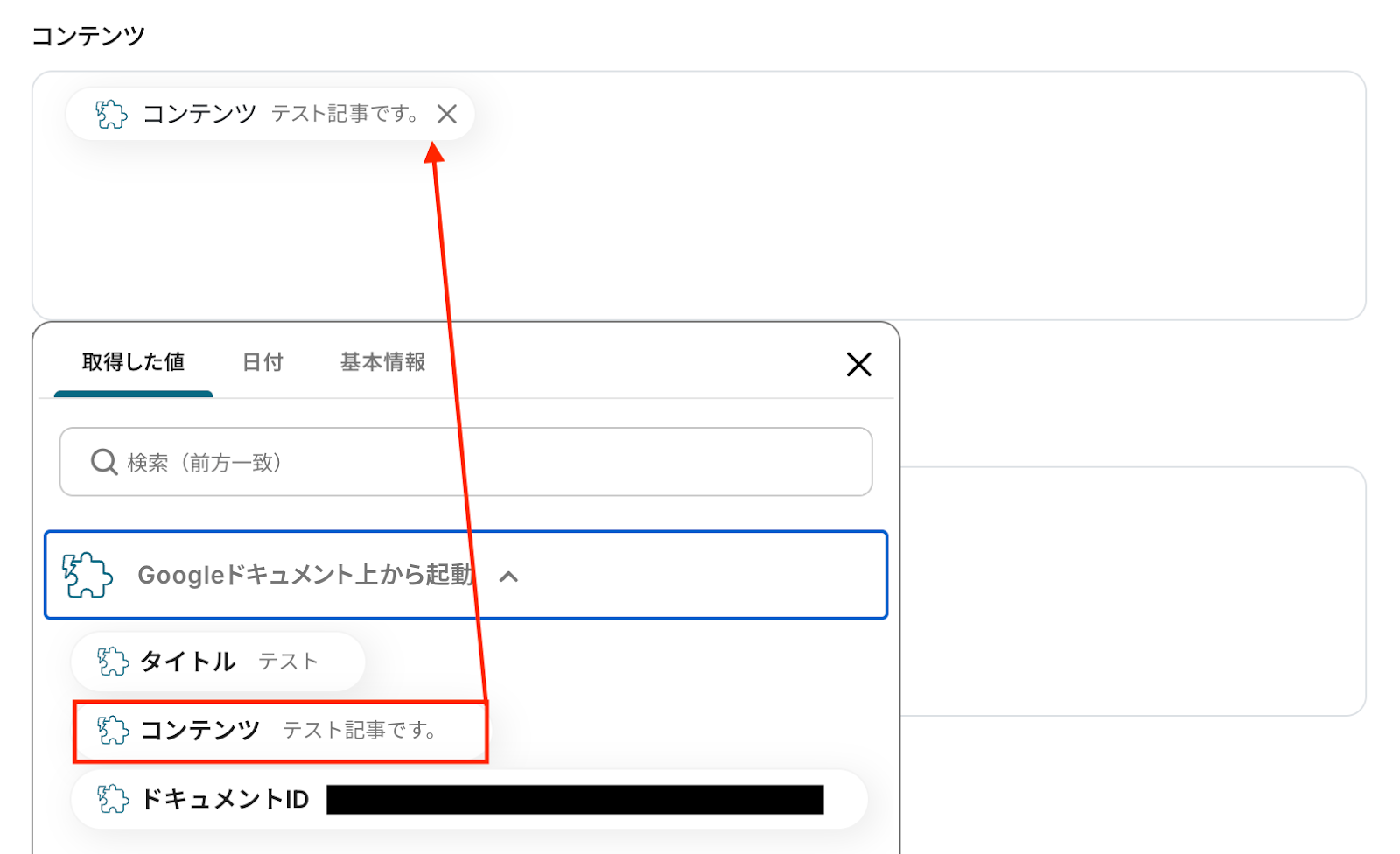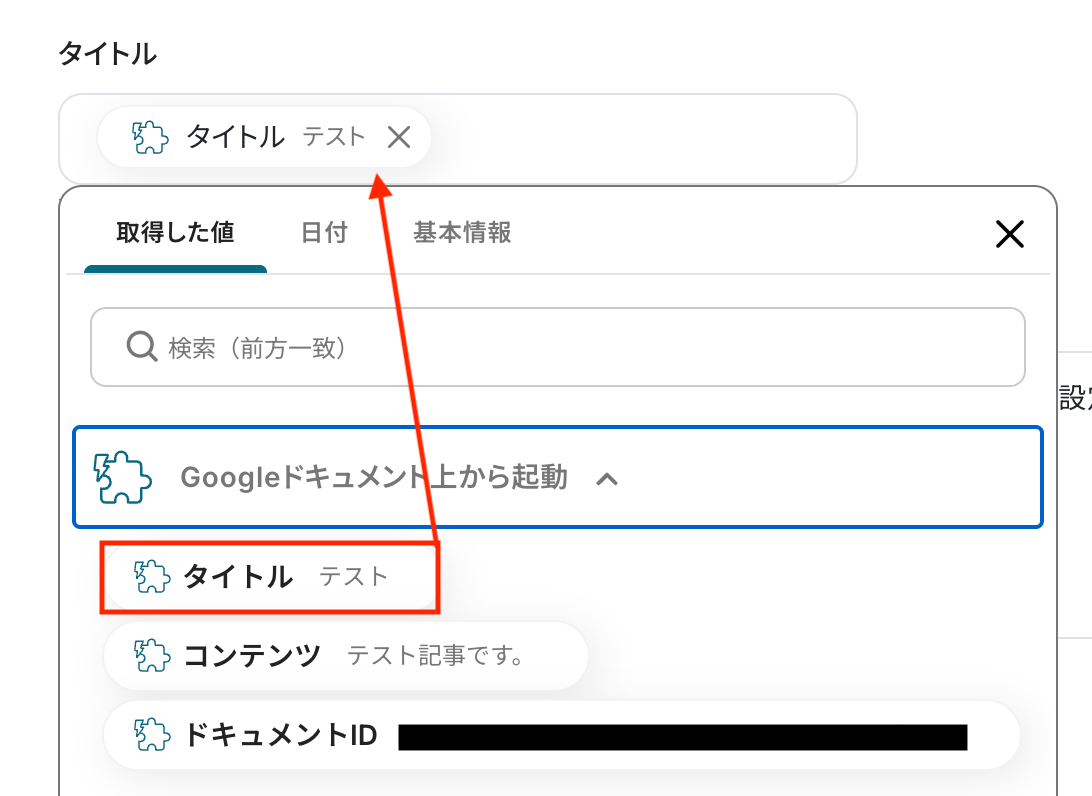 タイトル コンテンツ 入力欄をクリックすると、前のステップでGoogleドキュメントから取得した値が表示されるので、選択して入力しましょう。 なお、テキストを直接入力した部分は固定値とされるため、取得した値を活用せず設定を行うと毎回同じ内容がWordPress.orgで投稿されてしまうので注意が必要です。