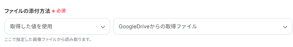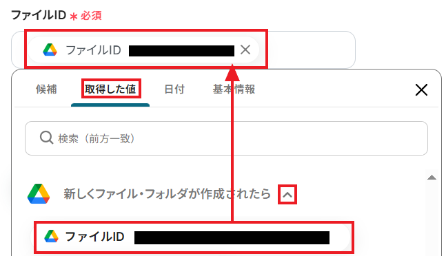 トリガーアクションで取得した値から、Google Driveの「ファイルID」を選択してください。