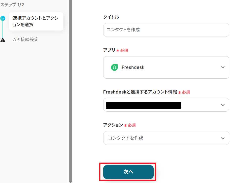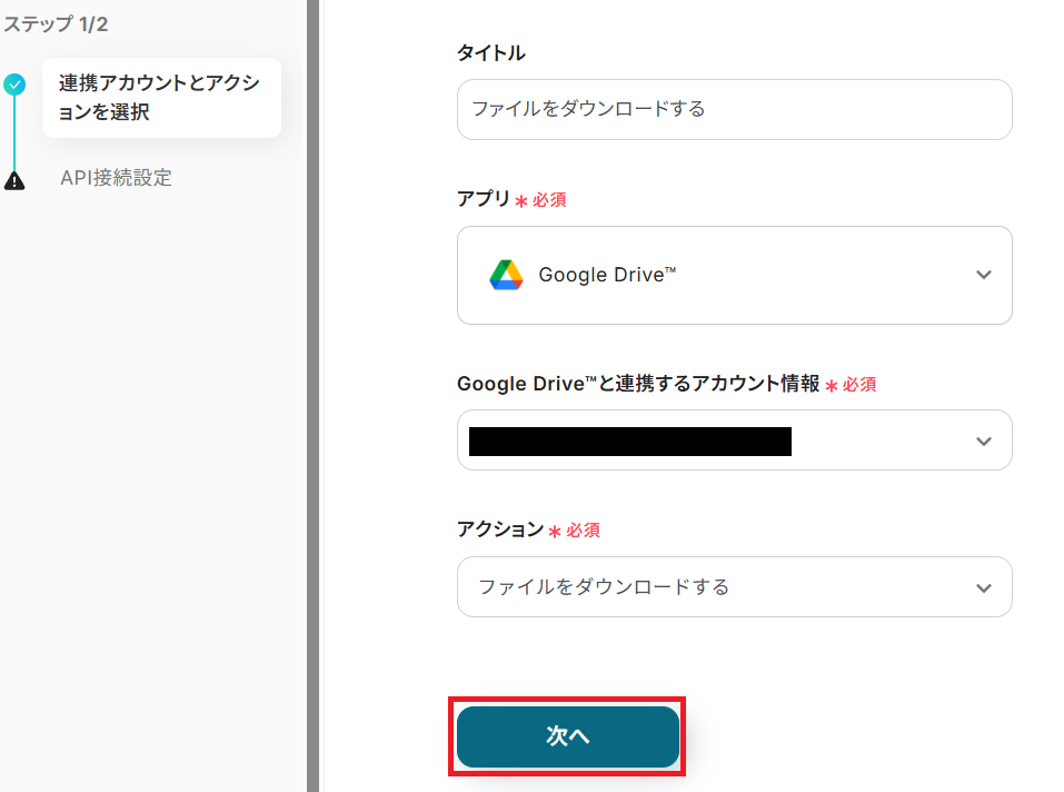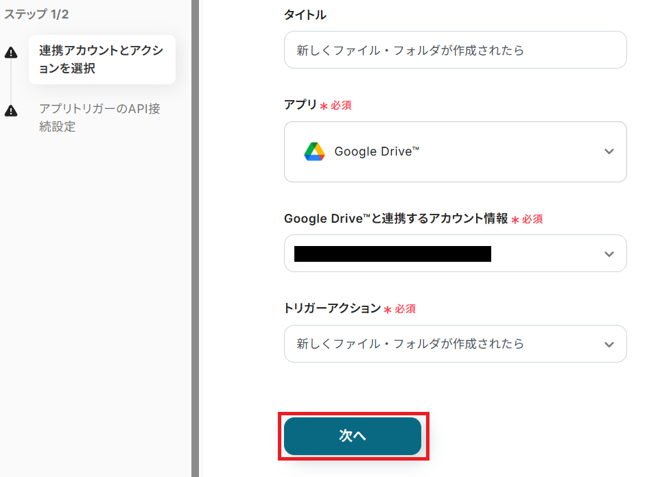 タイトルを任意で設定し、Google Driveと連携するアカウントやアクション内容を確認したら「次へ」を押してください。