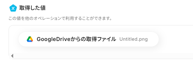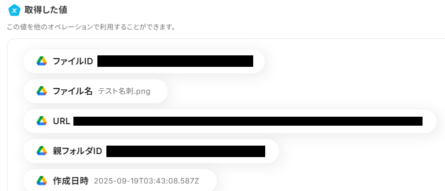 「テスト」ボタンを押してみて、Google Driveにアップロードしたファイルが「取得した値」に表示されていれば成功です!