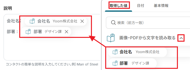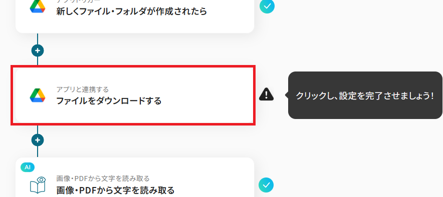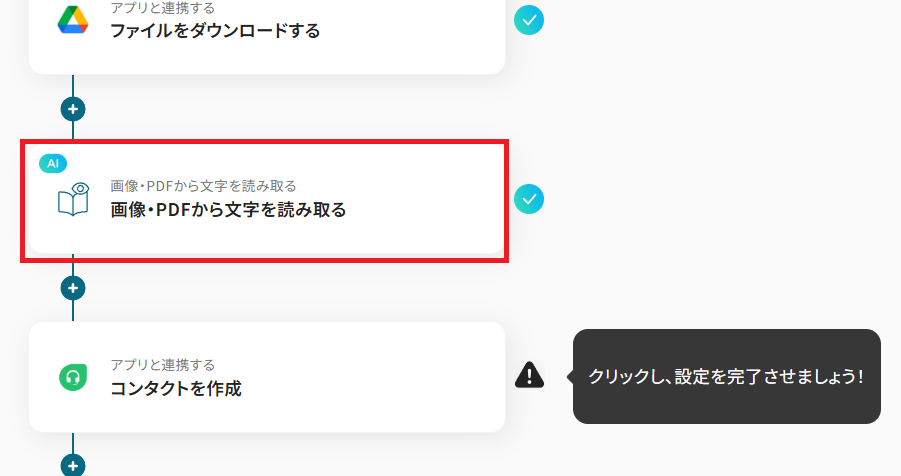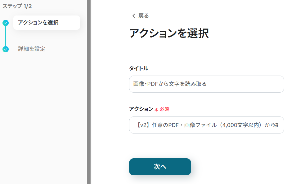 後続のステップで行うOCR機能では、アクション記載の規定の文字数を超えるデータや、文字が小さすぎる場合に正しく読み取れないことがあります。