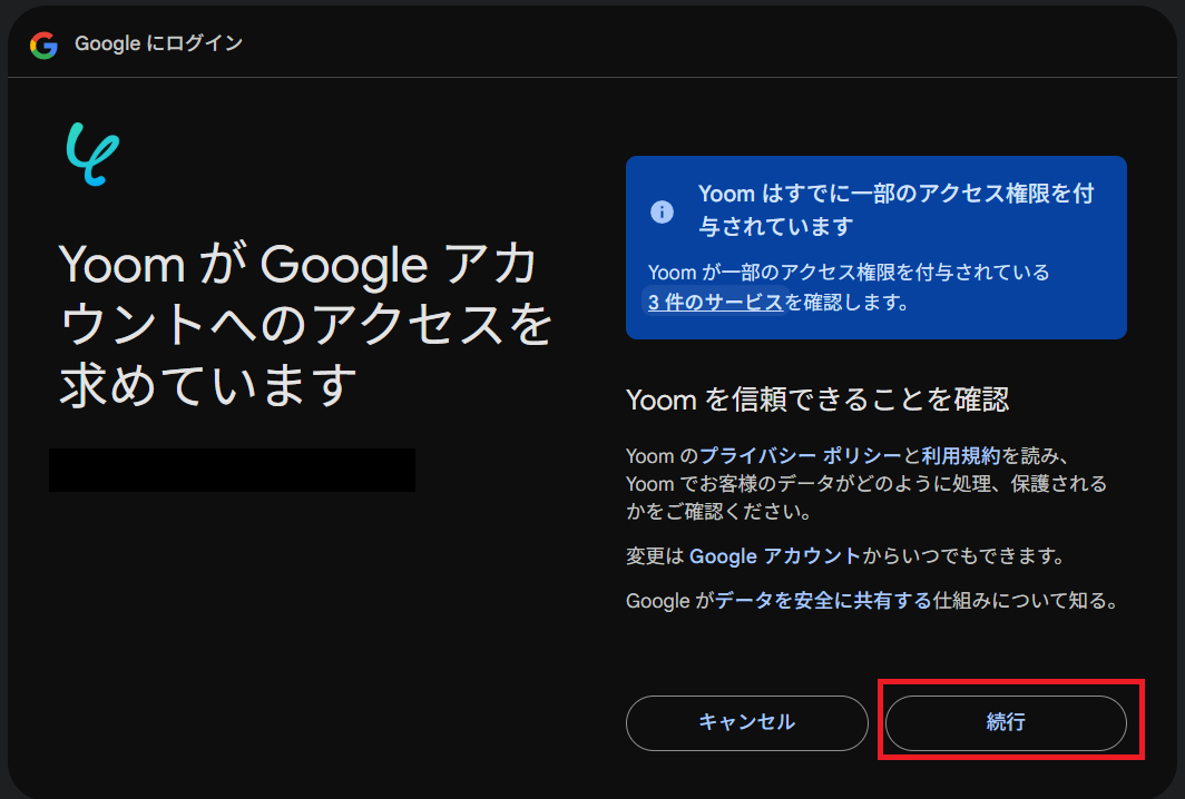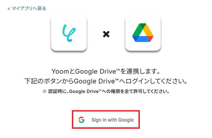 ログイン後、YoomがGoogle Driveアカウントに権限を求める画面に遷移します。
