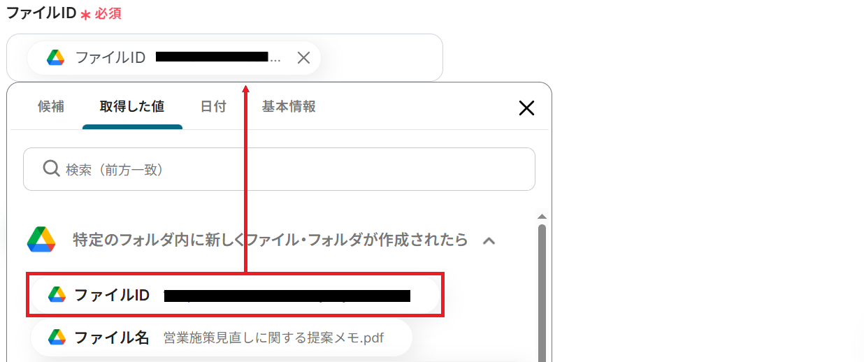 ・スプレッドシートID:欄をクリックし、候補から事前に用意したスプレッドシートを選択します。