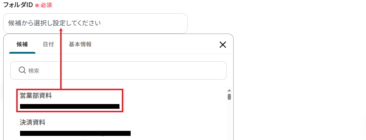 4.Google Driveのオペレーションで、メールから取得した添付ファイルと、保存先のフォルダを設定してください。