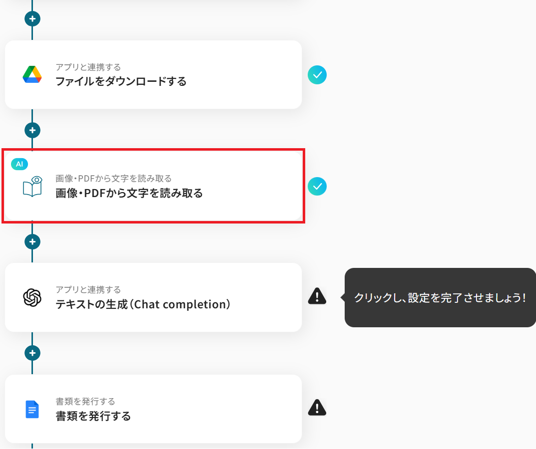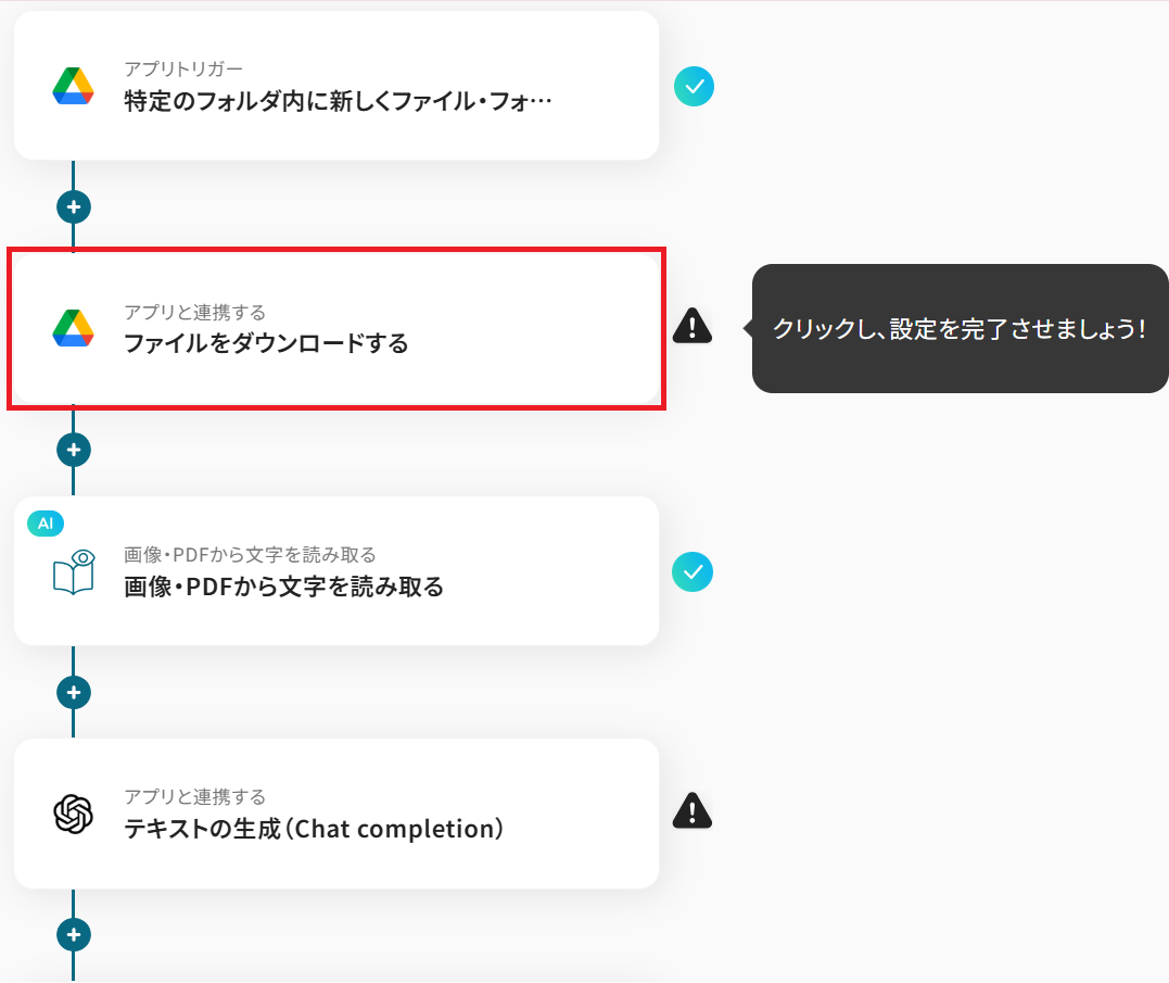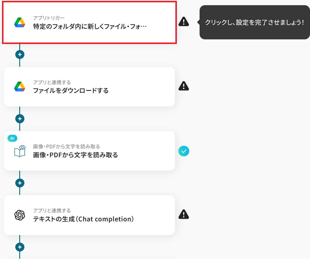 このワークフローを活用することで、Google Driveへのファイルアップロードをきっかけに、OCRによるテキスト抽出、OpenAIによる内容の分析、そしてGoogleドキュメントへの出力までの一連のプロセスを自動化できるため、こうした手作業の課題を解消します。
