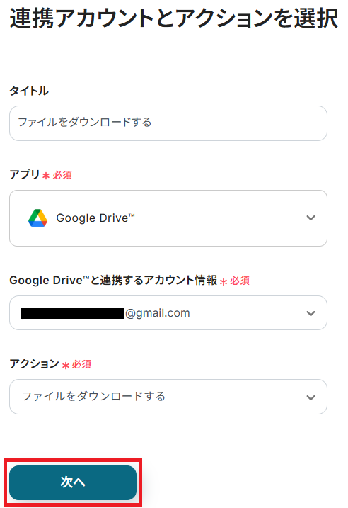 ステップ3と同様、アクションは「ファイルをダウンロードする」のまま「次へ」をクリック。