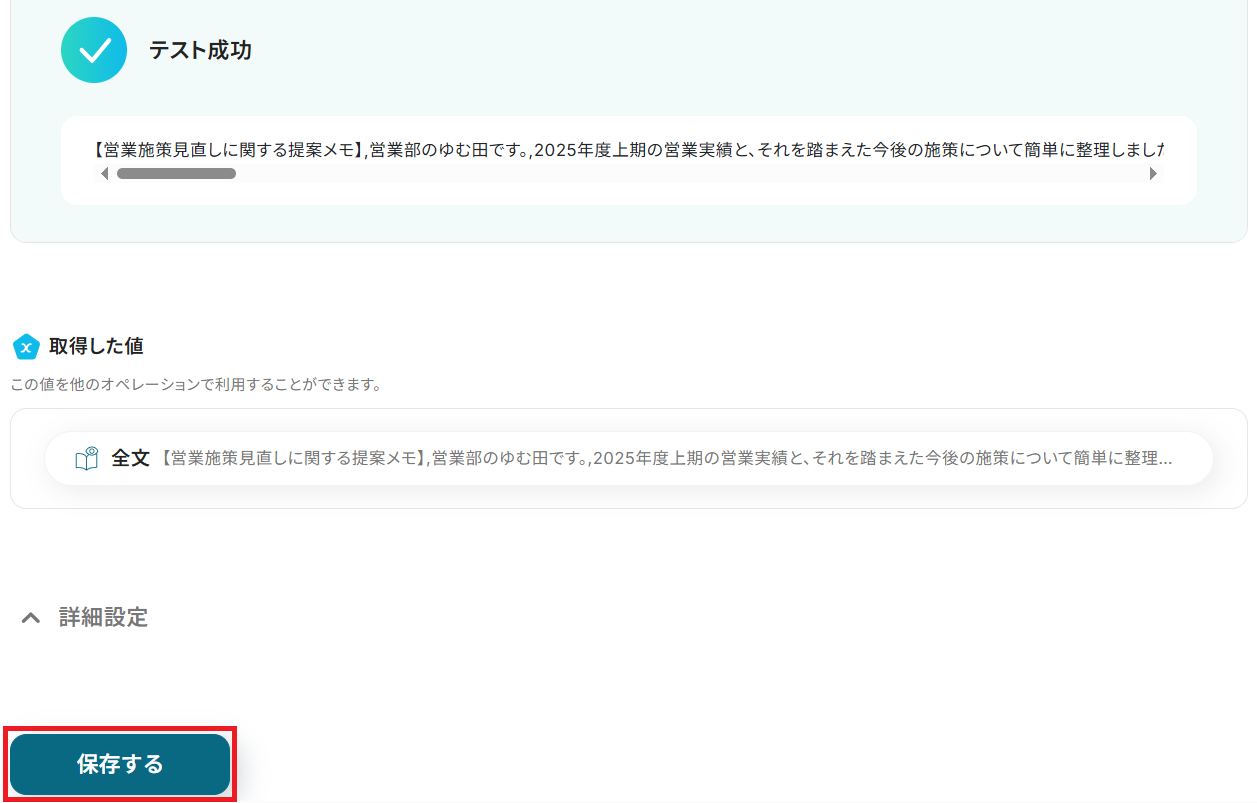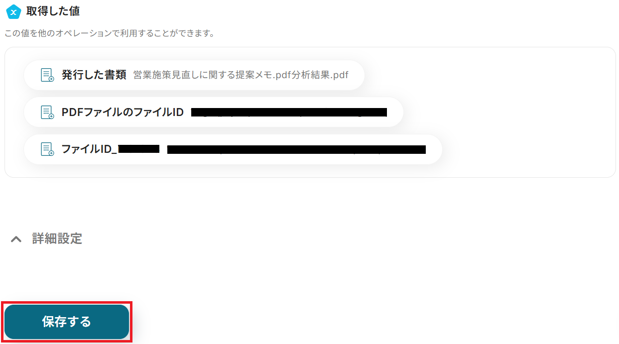 成功したら保存しましょう。ここで取得した値を次以降のステップで活用します。
