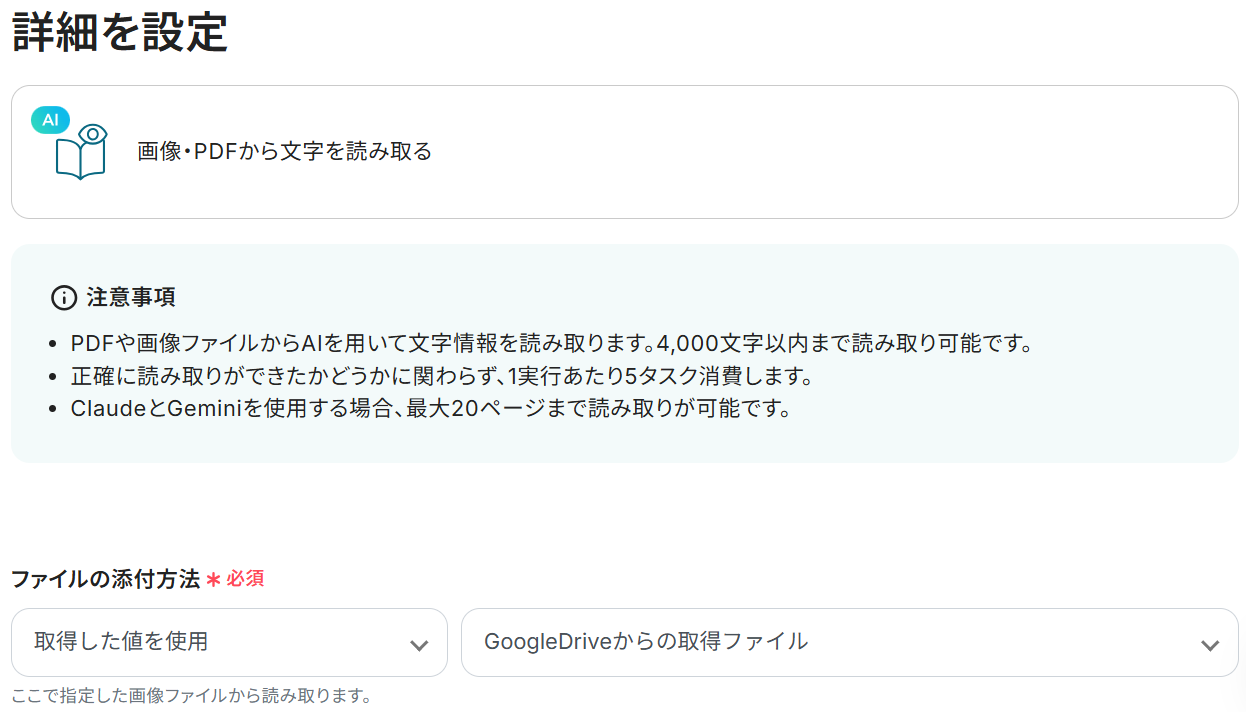 ※YoomのOCR機能では、アクション記載の規定の文字数を超えるデータや、文字が小さすぎる場合に正しく読み取れないことがあります。