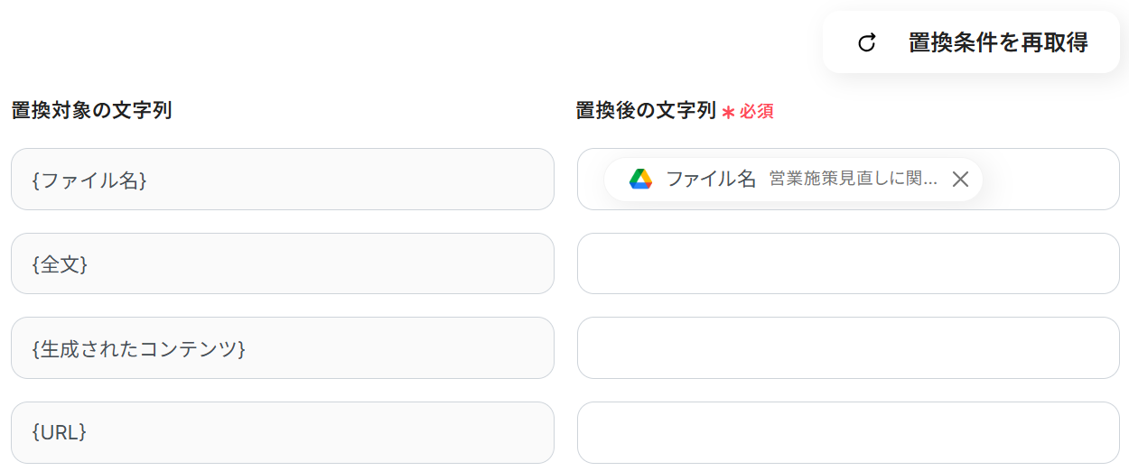 ・追加するレコードの値:表示された列名に対応する値を①で取得したアウトプットや②で取得した判定結果を埋め込みます。
