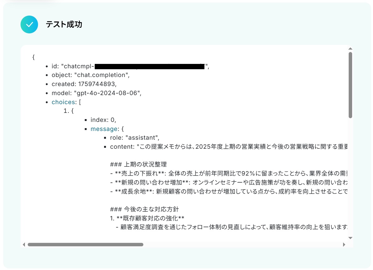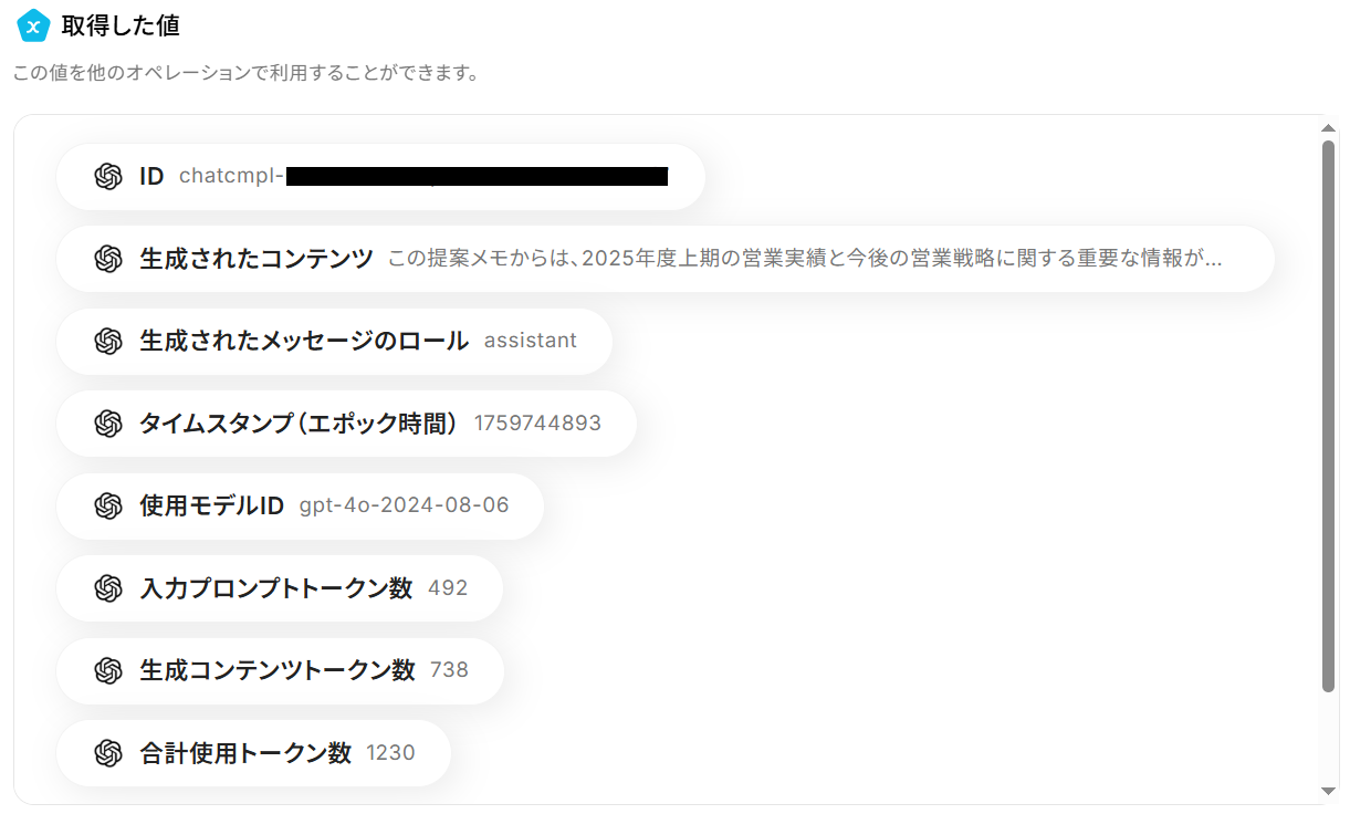 先ほど読み取ったファイルの内容をOpenAIの解析にかけます。
