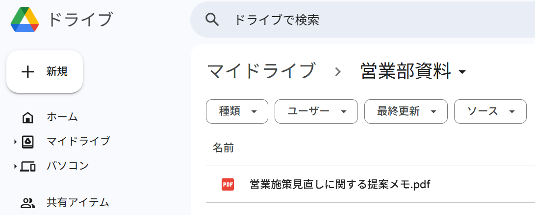 今回は例として「営業部資料」フォルダを作成し、提案資料を格納しました。