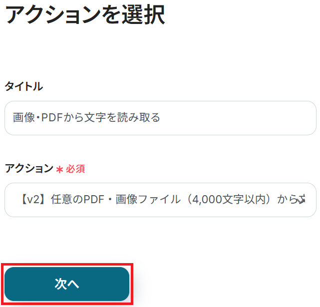ステップ3・4と同様、アクションは「【v2】任意のPDF・画像ファイル(4,000文字以内)から文字情報を読み取る(5タスク)」のまま「次へ」をクリックします。