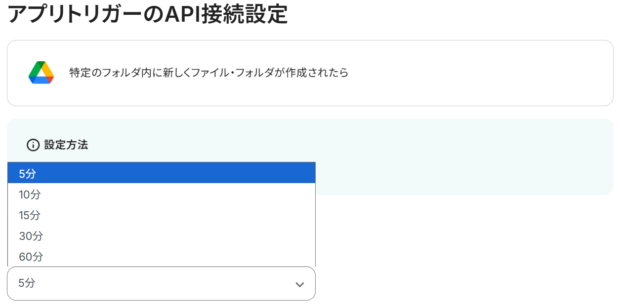 アプリトリガーのAPI接続設定という画面が表示されるので、まずトリガーの起動間隔をプルダウンから選択しましょう。