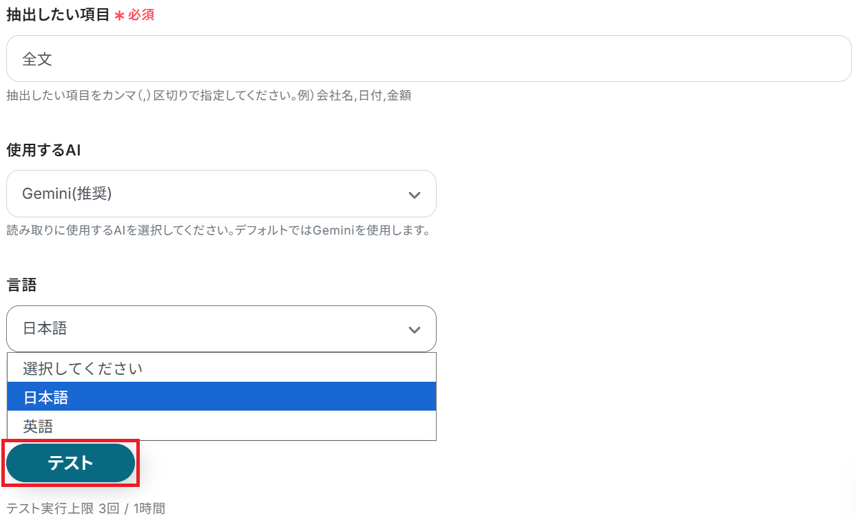 抽出したい項目は今回「全文」としていますが、一部だけ読み取りたい場合は必要事項をカンマ区切りで入力しましょう。