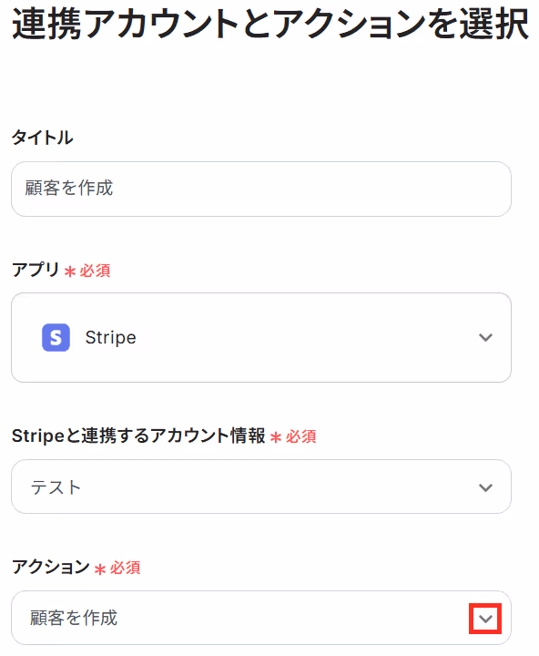 ステップ3と同様、アクションは「顧客を作成」のまま「次へ」をクリック。