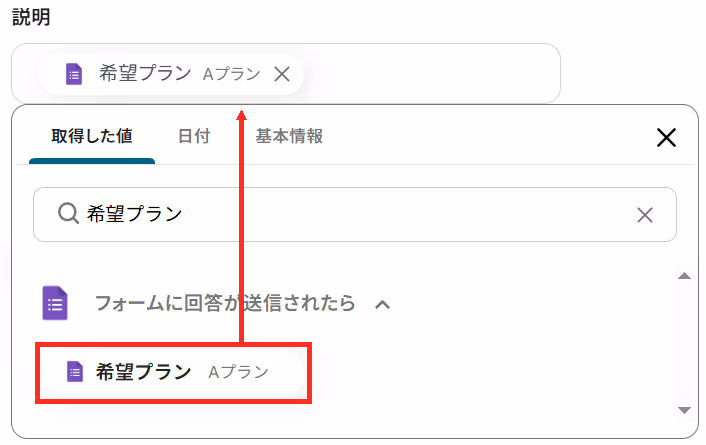例えばGoogleフォームに「希望プラン」や「備考」などの項目があった場合、その取得した値をStripeの「説明」欄に設定することで顧客情報に反映させることができます。