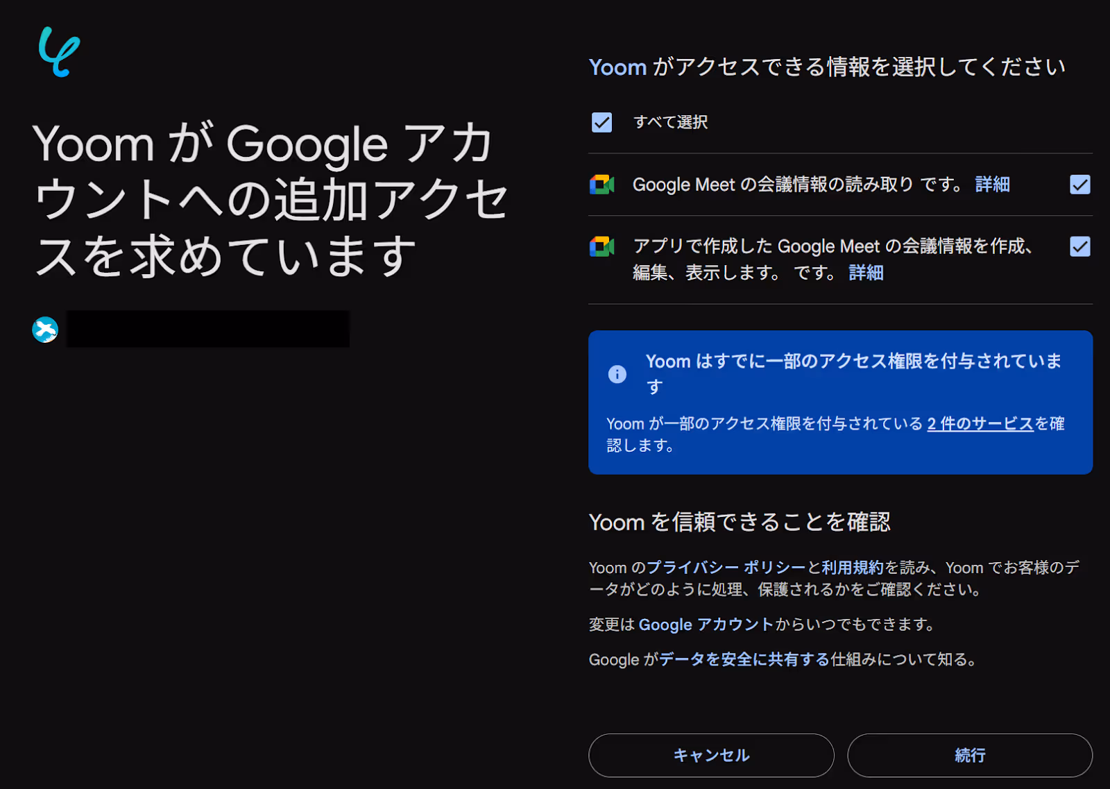Googleアカウントへのアクセス権限を全て許可して「続行」をクリックします。