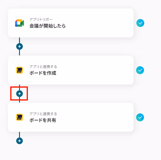 A:「ボードを作成」したアクションの後に、「+」ボタンからMiroの「ボードを共有」アクションを設定してください。
