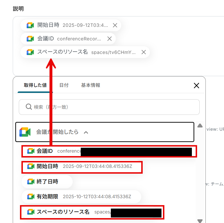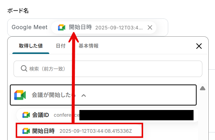 ボード名と説明の欄は、前項で取得した値を使用することができます。 取得した値を使用することで、値が固定化されずトリガーが実行されるたび新しい情報が反映されます。 以下のように、固定値と取得した値を組み合わせて設定することも可能です。