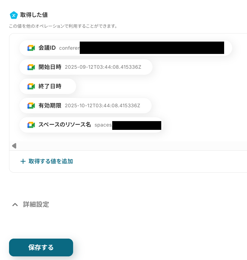 テストに成功すると以下のように表示され、取得した値が出力されます。 取得した値についてはこちらの記事 も参考にしてください。 確認し「保存する」をクリックしましょう。