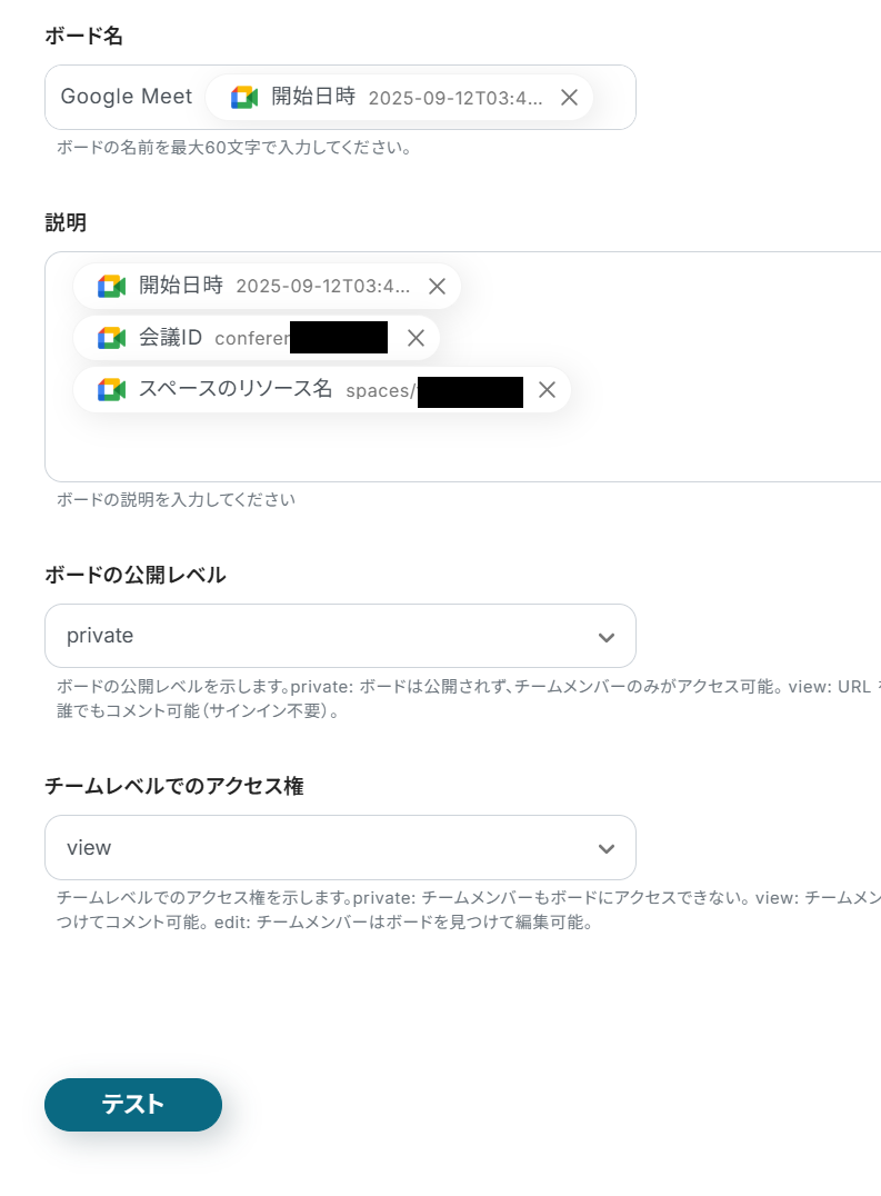 全て入力したら「テスト」をクリックしましょう。 テストが成功すると、Miroにボードが作成されます。