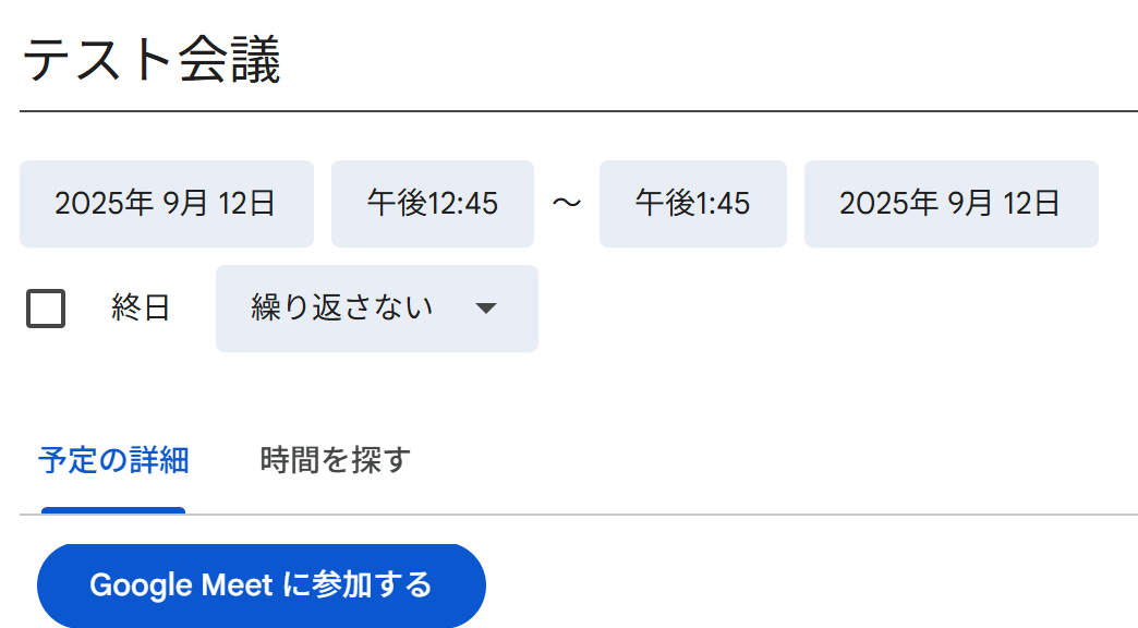 ここでGoogle Meetにテスト会議の予定を作成し、「Google Meetに参加する」をクリックしてください。 これでトリガーが起動する条件が整うため、Google Meetを閉じてYoomに戻りましょう。