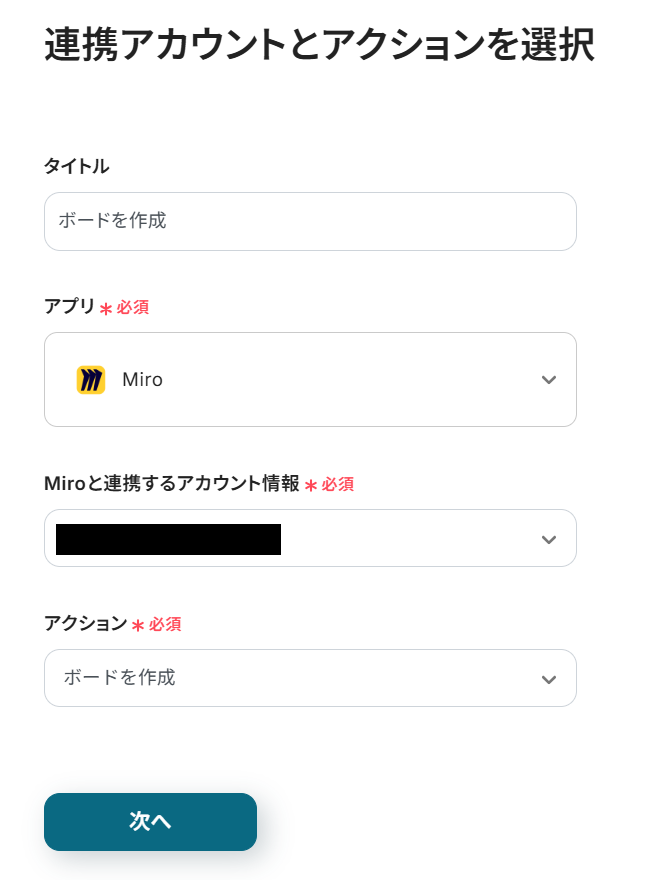次に2つ目の工程をクリックします。 前項で取得した値から、Miroでボードを作成する設定を行います。