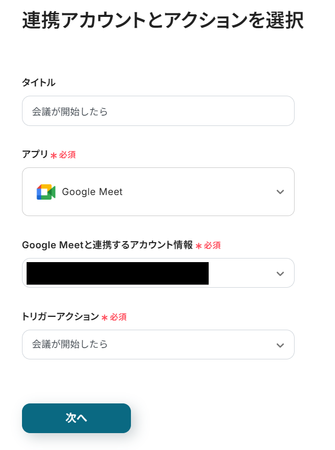 トリガーアクション:Google Meetの会議が開始したら起動します。