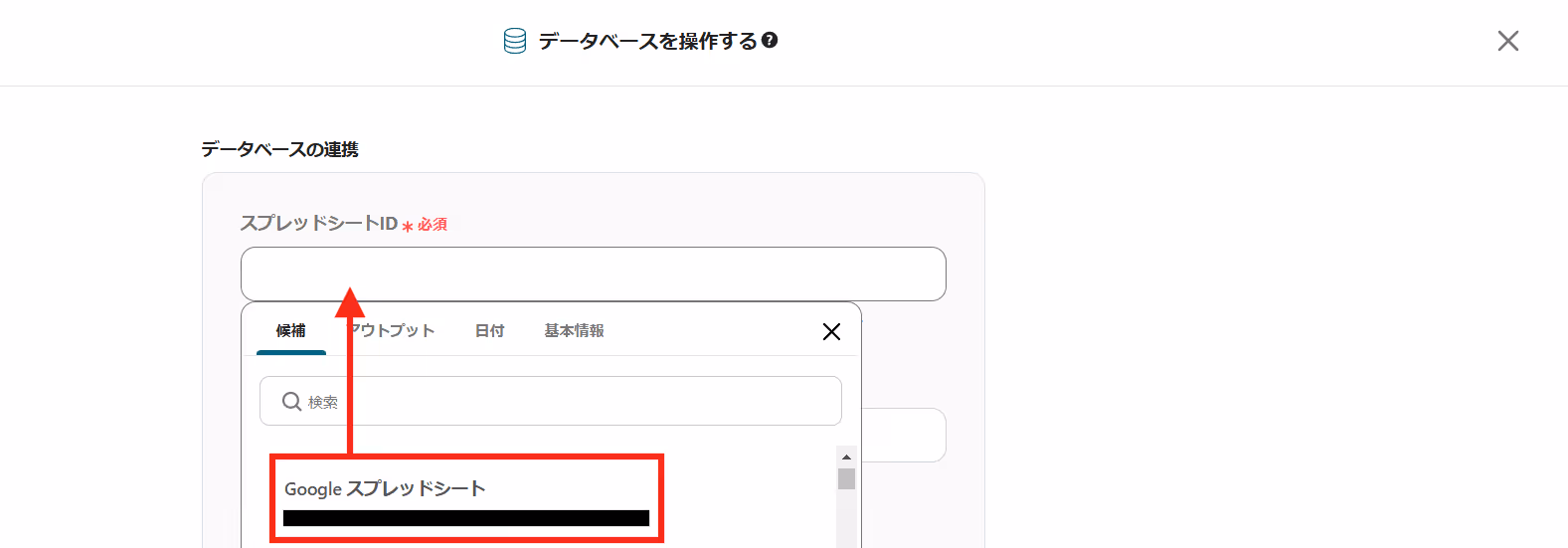 4.「スプレッドシートID」「シートID」は、入力欄をクリックして表示される候補から、先ほど作成したGoogle スプレッドシートの情報を選択しましょう。